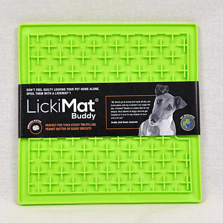 Lickimat Dog Buddy Anxiety Aid is a fantastic medical free way to promote calm behaviour in your pet while they are home alone or during stessful times for them like thunderstorms. Recommended by vets and animal behaviourists, Lickimat Dog Buddy Anxiety Aid helps your pet by releasing a calming hormone in their body which is stimulated by the repetitive licking motion.The Lickimat will also reduce boredom by making a fun and interactive tasty game - spread your pet's favourite chunky treat such as mushy meat or fish over the mat and they will spend ages enjoying their treat without being overfed.The licking enhances the taste of the food and also promotes good oral health by scraping bacteria off tongue as well as stimulating saliva production to clean tongue, teeth and gums and aid overall digestion.Lickimat Dog Buddy Anxiety Aid can be frozen for a sensational summer treat and is easy to clean by simply hand washing with soap and warm water to remove any residue after each use.Lickimat Dog Buddy Anxiety Aid is suitable for dogs of all ages and for cats as a slowfeeder and is available in 2 colours Orange And green.20 x 20 x 1cmReduces boredom while your pet is alone and calms them in stressful situations like thunderstormsRepetitive licking is soothing for your pet as it releases a calming hormoneSpread your pet's favourite treat over the surfaceMakes treat time fun and interactiveAllows for portion control so you can't overfeed your petPromotes overall oral health by scraping bacteria off tongue with continuous licking as well as promoting saliva production to clean tongue, teeth and gumsCross-maze design suitable for chunky treats such as mushy meat or fish for dogs or as a slowfeeder for cats