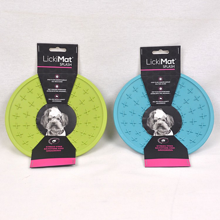Lickimat Dog Splash Anxiety Aid is a fantastic medical free way to distract your buddy at the vet, during bath time or at the groomer.Recommended by vets and animal behaviourists, Lickimat Dog Splash Anxiety Aid helps your pet by releasing a calming hormone in their body which is stimulated by the repetitive licking motion.The Lickimat has a suction cap which allows it to stick to any hard surface like tiles, glass and laminates and will keep your pet distracted by making a fun and interactive tasty game - spread your pet's favourite chunky treat such as mushy meat or fish over the mat and they will spend ages enjoying their treat without being overfed.The licking enhances the taste of the food and also promotes good oral health by scraping bacteria off tongue as well as stimulating saliva production to clean tongue, teeth and gums and aid overall digestion.Lickimat Dog Splash Anxiety Aid can be frozen for a sensational summer treat and is dishwasher safe for easy cleaning. Lickimat Dog Splash Anxiety Aid is suitable for both dogs and cats and is available in 2 colours.19 x 19 x 6cmSuction cap allows it to stick to any hard surface like tiles, glass and laminatesRepetitive licking is soothing for your pet as it releases a calming hormoneSpread your pet's favourite treat over the surfaceAllows for portion control so you can't overfeed your petPromotes overall oral health by scraping bacteria off tongue with continuous licking as well as promoting saliva production to clean tongue, teeth and gumsMade from natural rubber and is dishwasher safeSuitable for dogs and cats