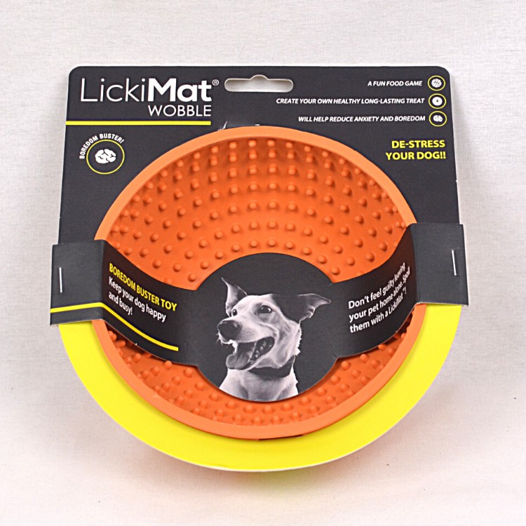 Lickimat Dog Wobble Anxiety Aid is a fantastic medical free way to promote calm behaviour in your pet while they are home alone or during stessful times for them like thunderstorms. Recommended by vets and animal behaviourists, Lickimat Dog Wobble Anxiety Aid helps your pet by releasing a calming hormone in their body which is stimulated by the repetitive licking motion.The Lickimat will also reduce boredom by making a fun and interactive tasty game - spread your pet's favourite chunky treat such as mushy meat or fish over the mat and they will spend ages enjoying their treat without being overfed. The licking enhances the taste of the food and also promotes good oral health by scraping bacteria off tongue as well as stimulating saliva production to clean tongue, teeth and gums and aid overall digestion.Lickimat Dog Wobble Anxiety Aid can be frozen for a sensational summer treat and is easy to clean by simply hand washing with soap and warm water to remove any residue after each use. Lickimat Dog Wobble Anxiety Aid is suitable for dogs of all ages and for cats as a slowfeeder.Orange and Green16 x 11 x 16cmReduces boredom while your pet is alone and calms them in stressful situations like thunderstormsRepetitive licking is soothing for your pet as it releases a calming hormoneSpread your pet's favourite treat over the surfaceAllows for portion control so you can't overfeed your petPromotes overall oral health by scraping bacteria off tongue with continuous licking as well as promoting saliva production to clean tongue, teeth and gumsMade from natural rubber and is dishwasher safeSuitable for chunky treats such as mushy meat or fish for dogs or as a slowfeeder for cats