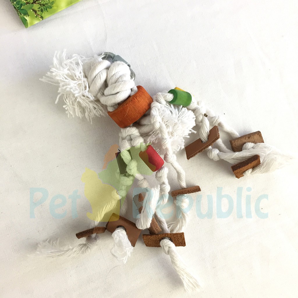 Living World®’s extensive line of Junglewood bird toys feature a wide variety of provocative hanging toys specially designed to entertain and stimulate play, exercise, and activity.Birds will enjoy hours of fun and amusement.Each unique toy consists of a combination of interesting trinkets such as solid wood shapes, rugged rope, plastic beads, leather strips & bells.Every toy comes with a hanging clip for easy in-cage installation.Available in assorted shapes, sizes and colours.Junglewood Small Rope with wood cylinders, leather strips & bell.