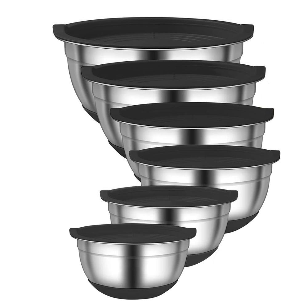 LMETJMA 6 шт. миски для смешивания из нержавеющей стали с черными крышками, кухонная вложенная миска для смешивания салата с нескользящим силиконовым дном JT327