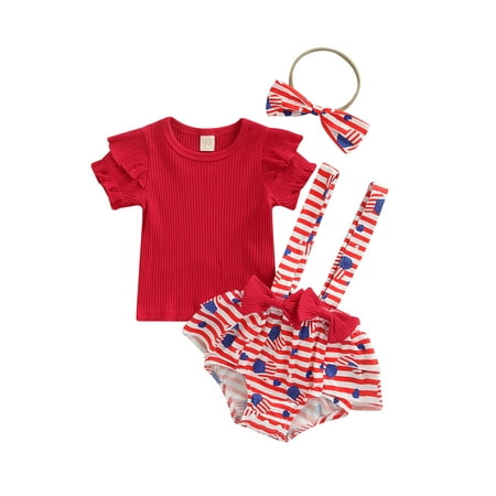 Nokpsedcb Newborn Infant Baby Girls 3Pcs Clothes Fly Sleeve Shirt Stripe Heart Star Pattern Suspenders Shorts Headband Red 12-18 Months