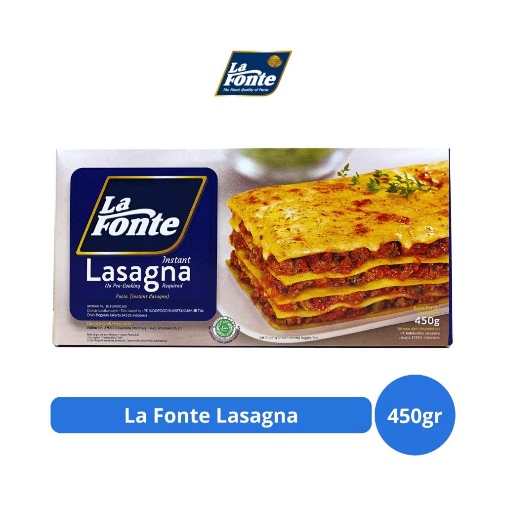 La Fonte Lasagna merupakan satu-satunya Lasagna di Indonesia yang bersertifikat HALAL dari MUI. La Fonte Lasagna adalah pasta yang berbentuk lembaran pipih. Diproduksi langsung di Italia, menggunakan gandum durum Italia pilihan.