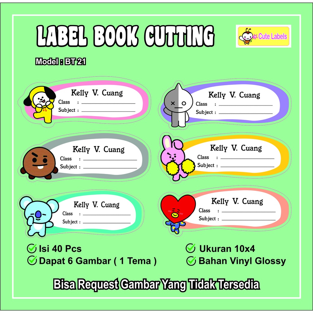 Label dengan ukuran yg cocok utk buku sekolah dan dapat tulis sendiri subject dan kelasnya, cutting mengikuti bentuk gambar