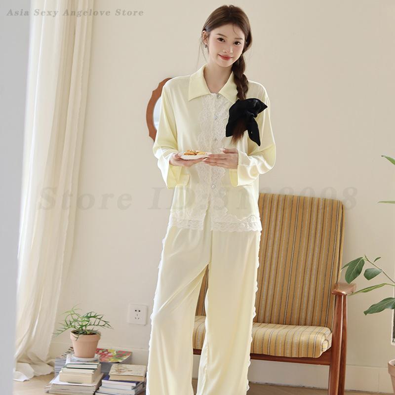Кружевные топы и штаны, атласные пижамы, нежный и повседневный комплект из 2 предметов пижамы, пижамы для женщин, домашняя одежда, комплект с брюками с длинными рукавами, пижамы M жёлтый