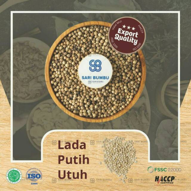 Lada putih Utuh yang di proses dengan sangat higienis dengan standar mutu Internasional. Lada putih Utuh ini murni tanpa campuran dan melewati 3 tahapan pembersihan dengan mesin standar produksi untuk Ekspor ke Jepang. Citara rasa original dengan aroma yang berkelas membuat Lada putih Utuh ini biasa digunakan untuk penggunaan Industri Makanan (Bumbu), Pengemasan ulang retail, Produk F&B, Restaurant, Makanan Cepat Saji, Kafe, Bakery, Penggunaan Rumah tangga.