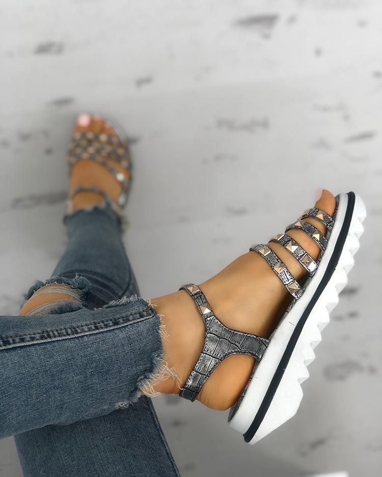 Ladies Rivet Multi-strap Platform Muffin Sandals, Silver