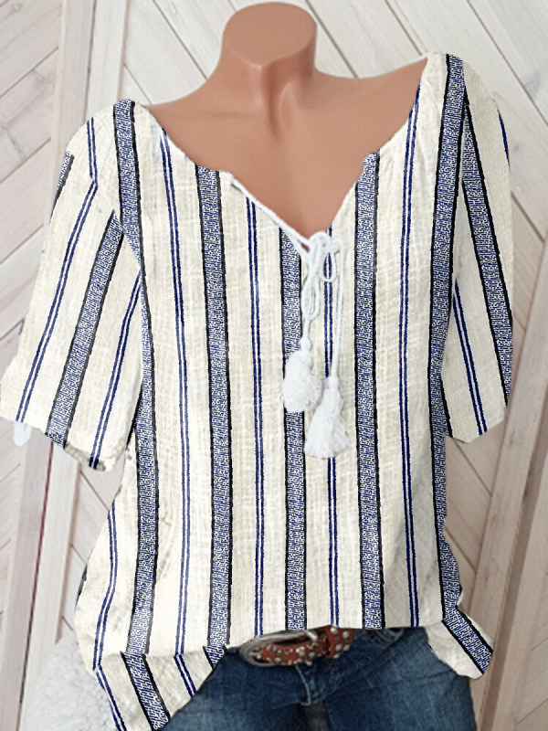 blouses,ladies striped v-neck short sleeve shirt
