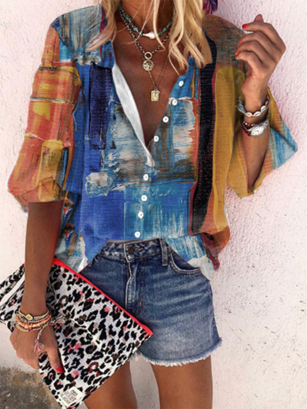 blouses,ladies abstract print lapel five-point sleeve shirt