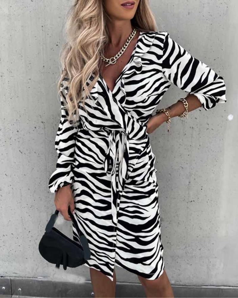 Lantern Sleeve Zebra Stripe Print Ruffles Dress With Belt, Leopard