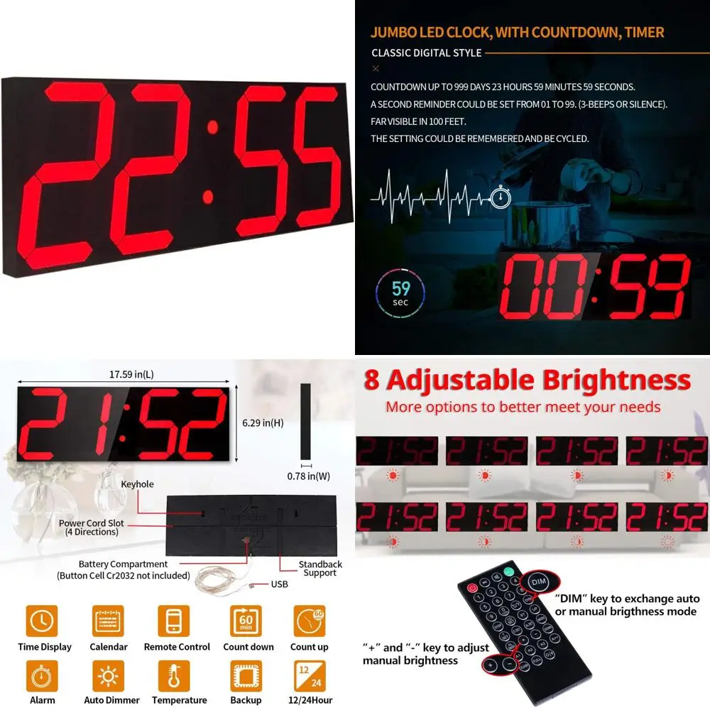 Large 18 Inch LED Wall Clock with Digital Display, Temperature, and Remote Control Functionality