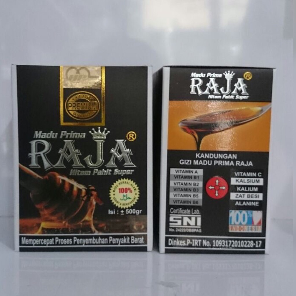 Madu Prima Raja Hitam Pahit Super, merupakan madu yang berkualitas tinggi dan diformulasikan secara khusus untuk membantu proses teraphi dan pengobatan berbagai penyakit, madu hitam pahit ini mengandung vitamin A, vitamin B1, vitamin B2, vitamin B3, vitamin B5, vitamin B6, vitamin C, kalsium, kalium,zat besi dan alanine, sehingga madu pahit hitam ini mampu memepercepat proses penyembuhan dan menjaga kesehatan Anda. Semua komposisi madi htam pahit diproses secara higenis dengan menggunakan teknologi yang modern, supaya tetap terjaga kualitasnya.