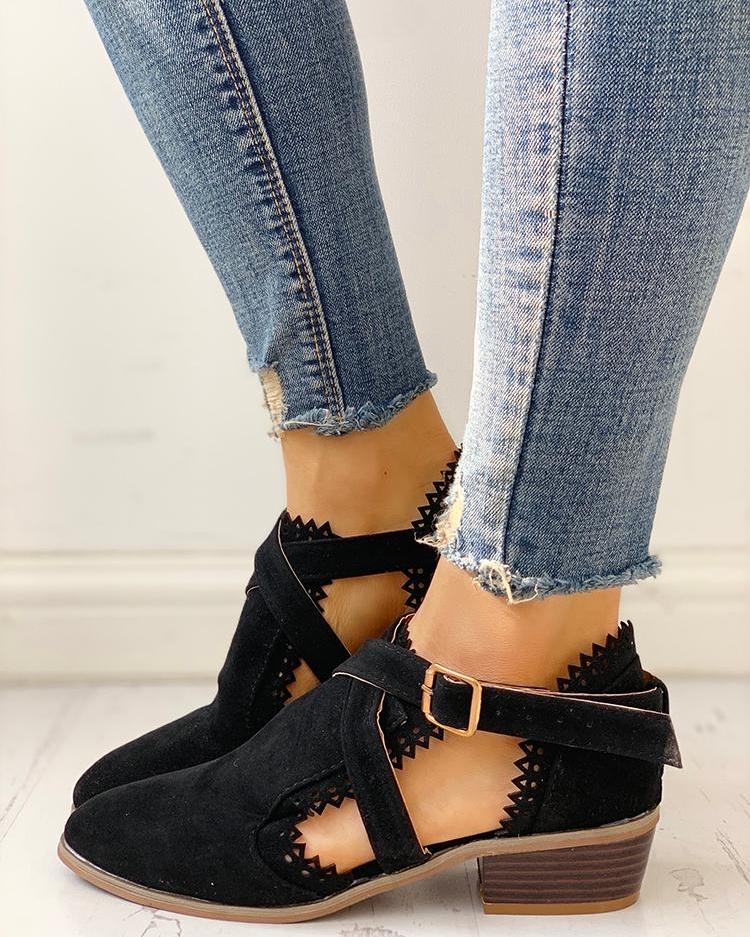 Laser Cut Pointed Toe Chunky Heels, Black