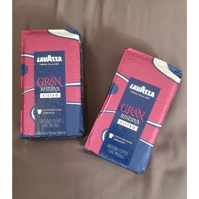 Lavazza Gran Riserva Filtro. Torino Italia 1985. Dark Roast. Ground Coffee. Net Weight 226.8gr. 100% Arabica.