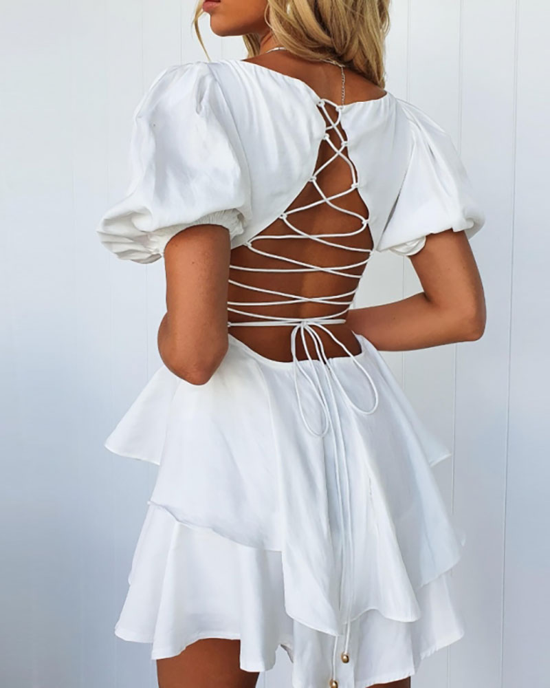 Layered Backless Lace Up Ruched Puff Sleeve Romper, White