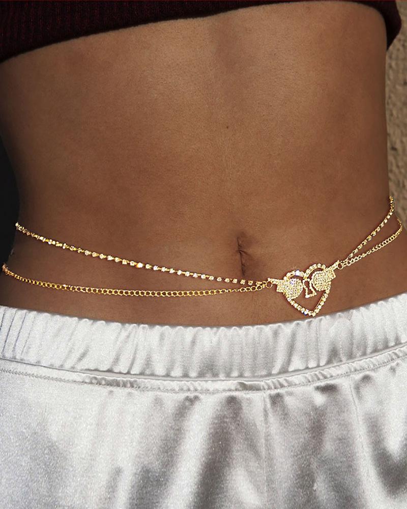 Layered Rhinestone Heart Wings Pattern Waist Chain, Gold