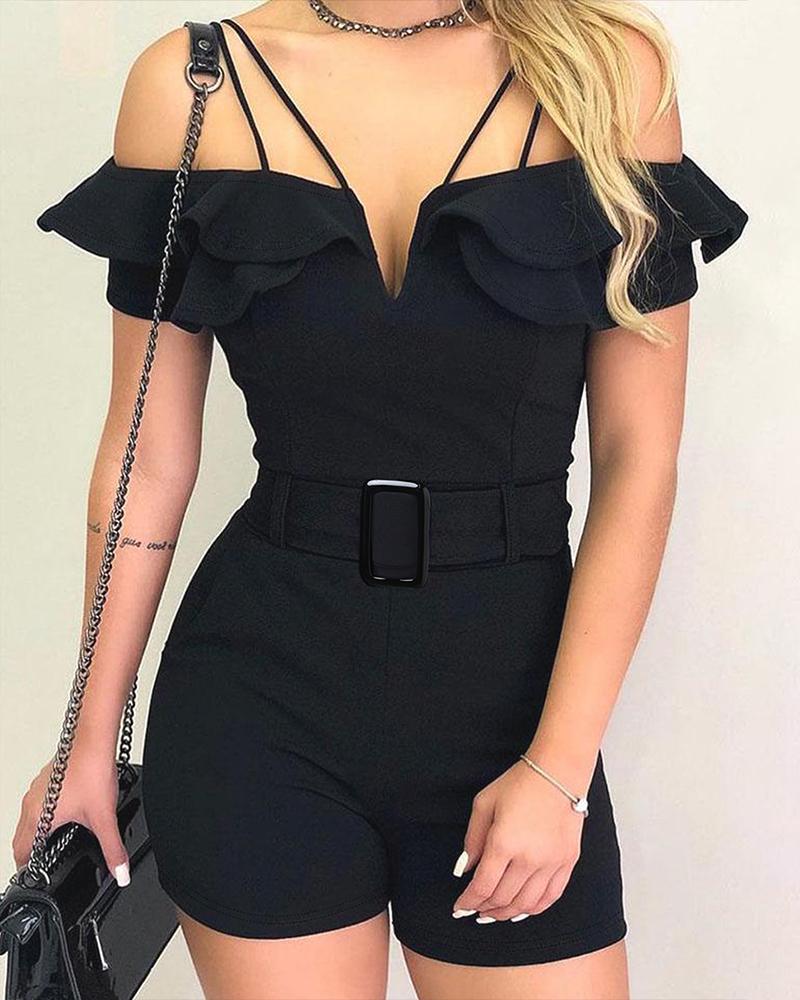 Layered Ruffles Cold Shoulder Belted Romper, Black