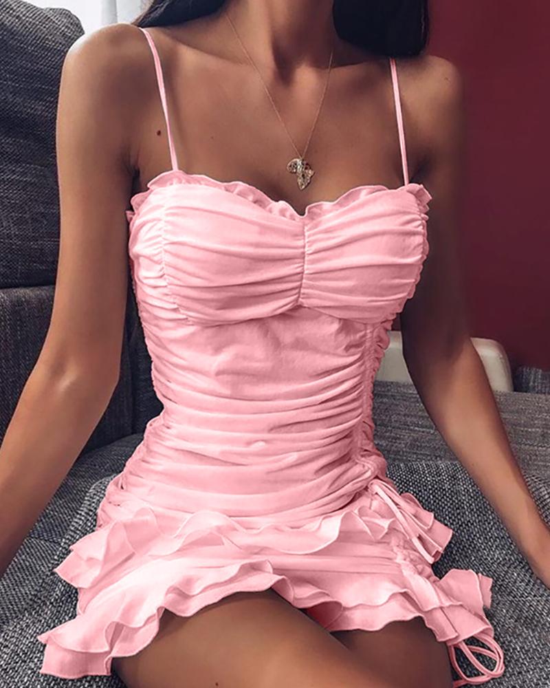Layered Ruffles Drawstring Frill Hem Mini Dress, Pink