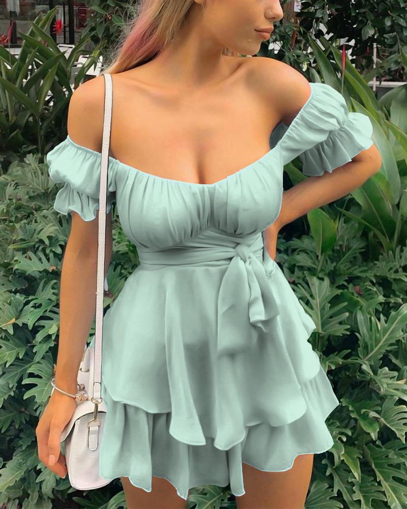 Layered Ruffles Off Shoulder Ruched Mini Dress, Light green