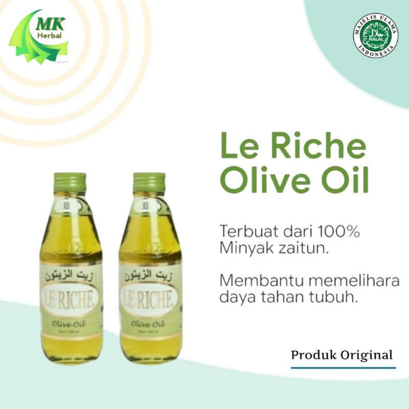 Minyak Zaitun Le Riche merupakan salah satu minyak zaitun terbaik yang ada di Indonesia, Minyak Zaitun memang sudah dikenal dari jaman dahulu kala sebagai obat maupun alat kecantikan para ratu jaman dahulu. Minyak Zaitun Le Riche mempunyai banyak manfaat untuk kesehatan tubuh kita, untuk kecantikan Minyak Zaitun Le Riche dapat membantu menghaluskan kulit dan meremajakan. Minyak Zaitun terkenal dapat mengurangi resiko penyakit jantung dan kanker. Penelitian di mediterania menunjukan bahwa Minyak Zaitun dapat mengurangi resiko kematian hingga 50% dibandingkan dengan orang yang tidak biasa mengkonsumsi Minyak Zaitun.