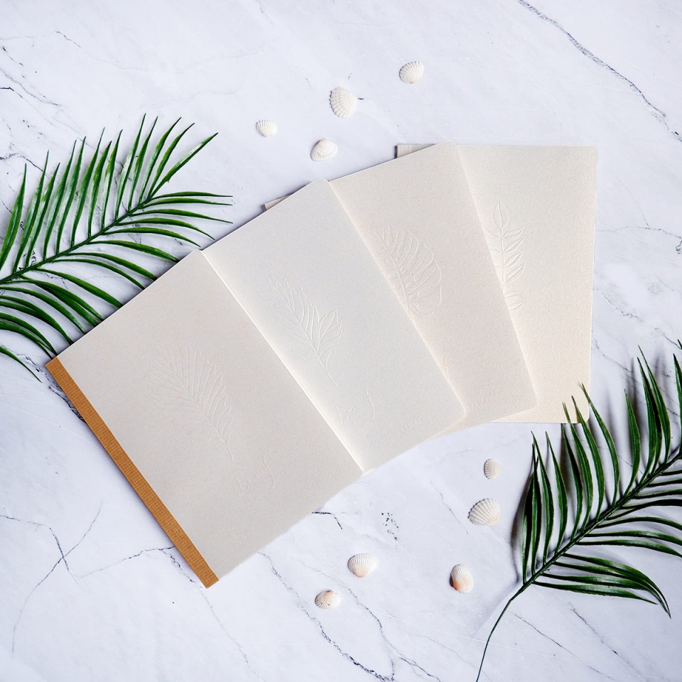Kesenangan menulis semakin bertambah di atas buku ini. Tekstur dan kesan unik pada sampulnya berasal dari bahan kertas Jasmine, yang umumnya ditemukan pada kartu undangan dan kreasi DIY. Permukaan sampul yang elegan dan sedikit berkilauan ini dihias lagi dengan cetakan timbul bergambar daun, yang bisa kamu pilih dari 4 variasi yang ada. Pilih dari 2 jenis isi halaman yang paling cocok untukmu: bergaris biasa atau kotak-kotak.