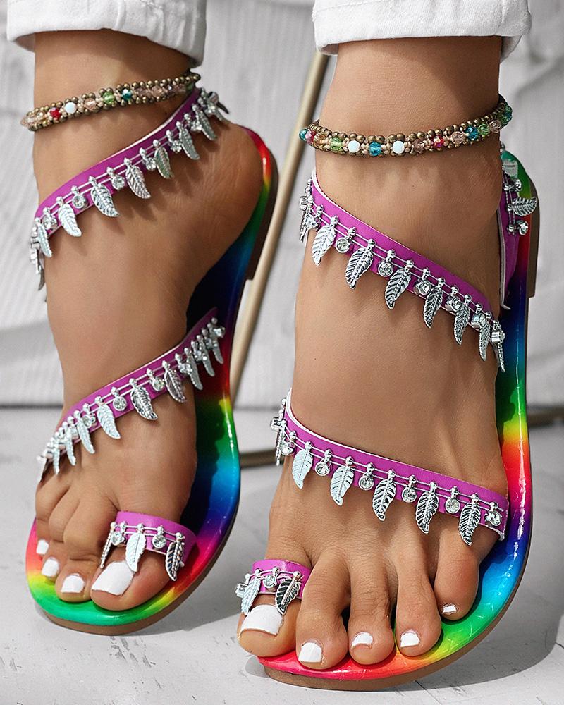 Leaf Pattern Rainbow Ombre Toe Post Sandals, Multicolor