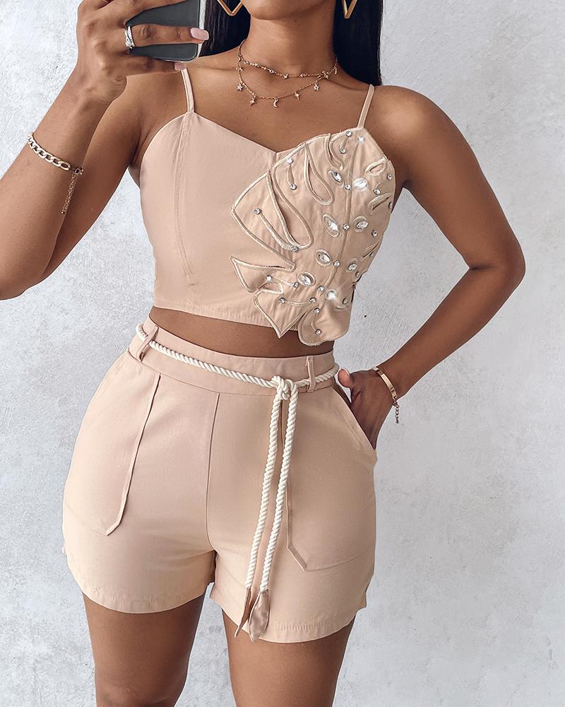 Leaf Pattern Rhinestone Decor Top & Shorts Set, Khaki