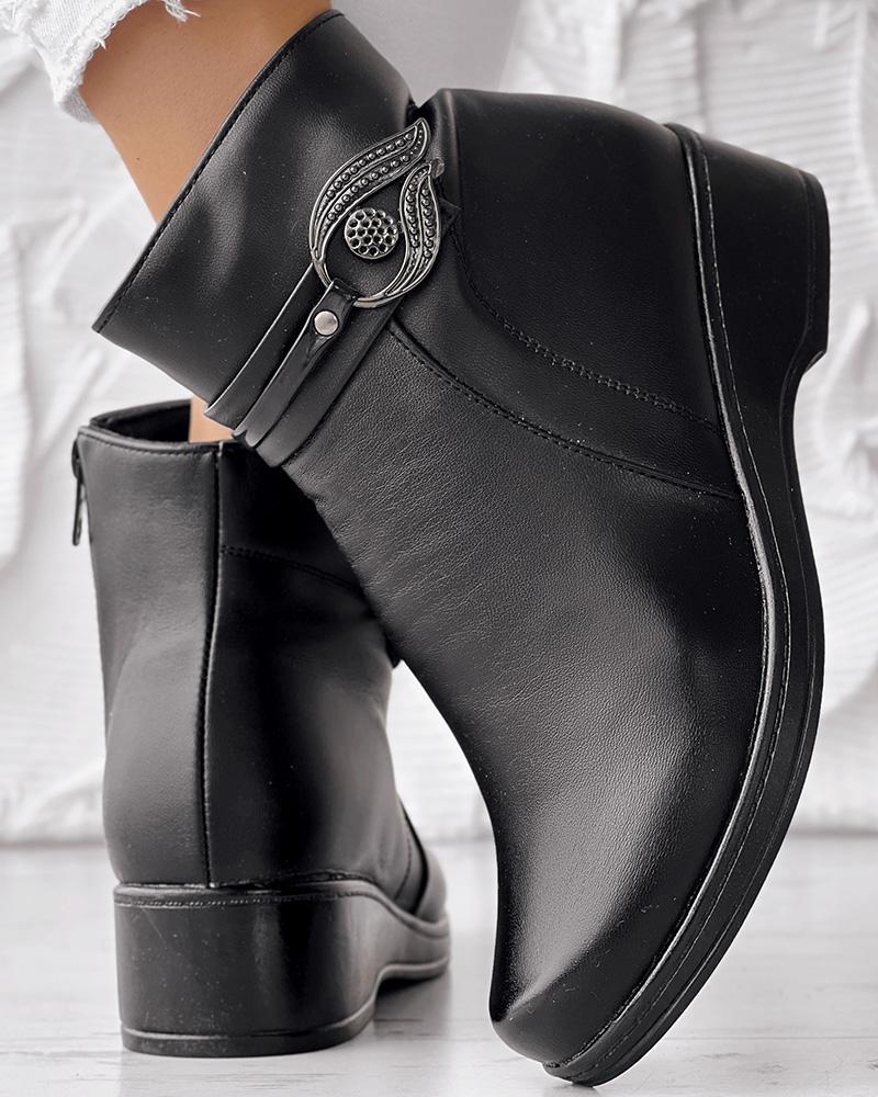 Leaf Pattern Zipper Design Wedge Ankle Boots, Black