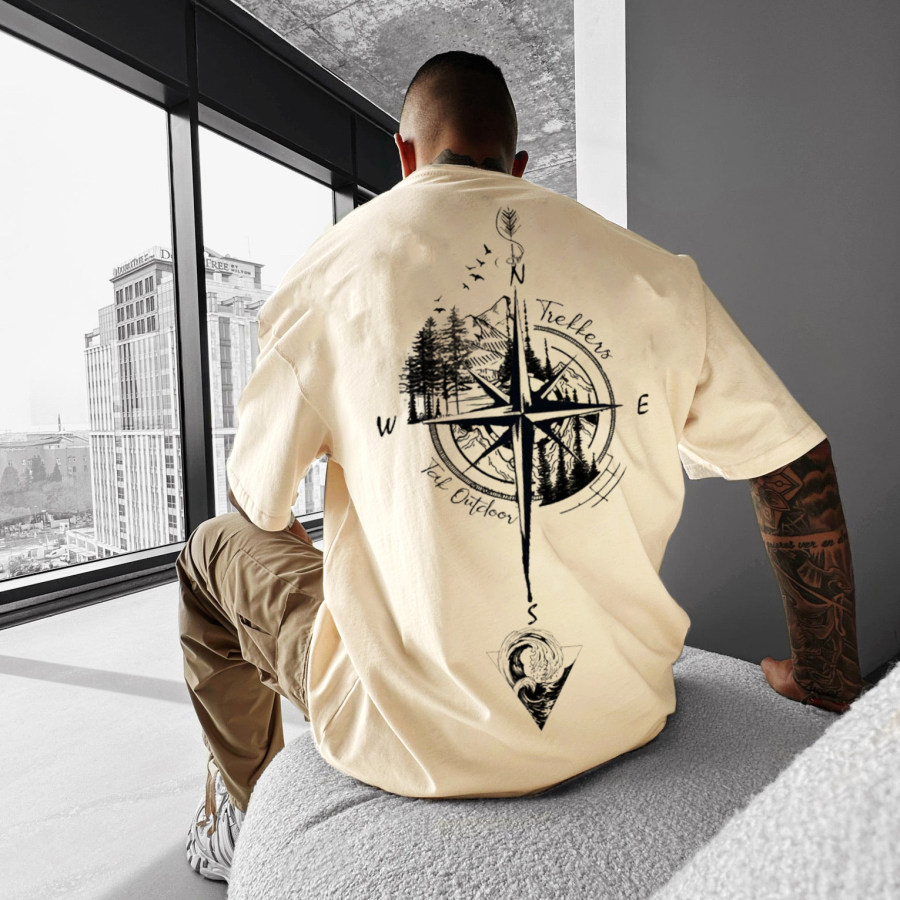 t-shirts,leisure compass landscape printed round neck t-shirt