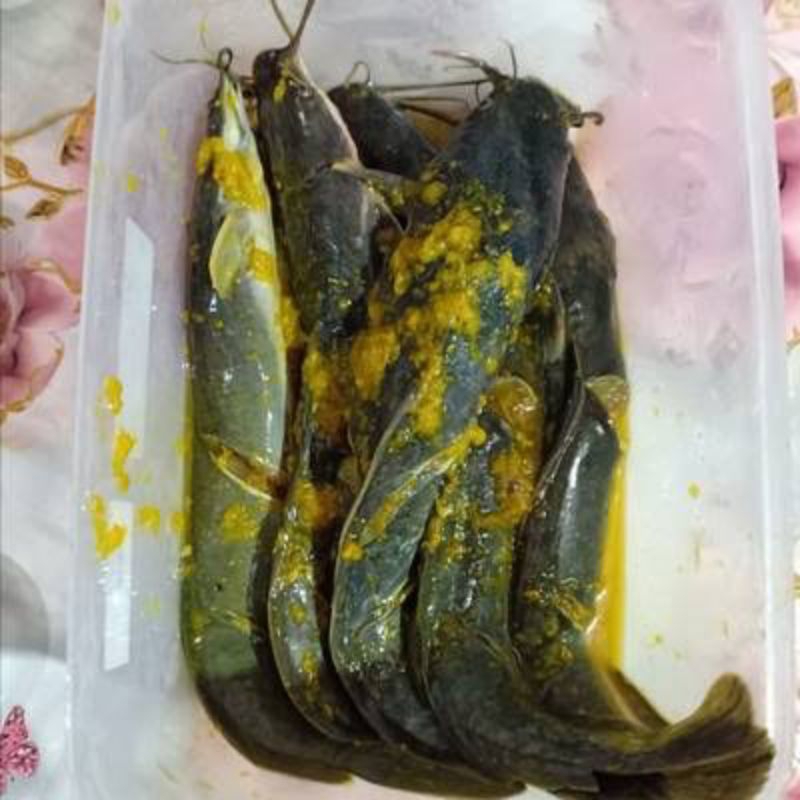 Lele segar dibersihkan & dimarinasi dengan bumbu kuning khas