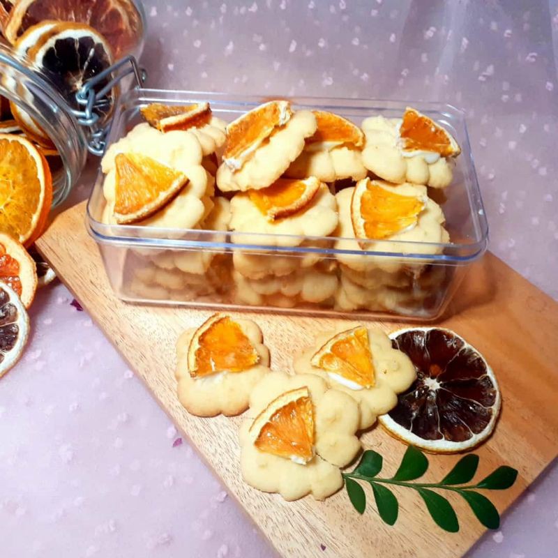 kue rasa lemon dengan hiasan buah jeruk kering di atasnya