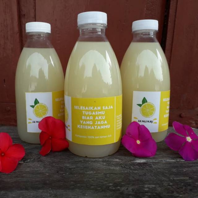 diperas dari sari buah jeruk lemon murni 100% tanpa bahan pengawet dan campuran apapun sehingga aman dikonsumsi. dalam kemasan botol 350 ml