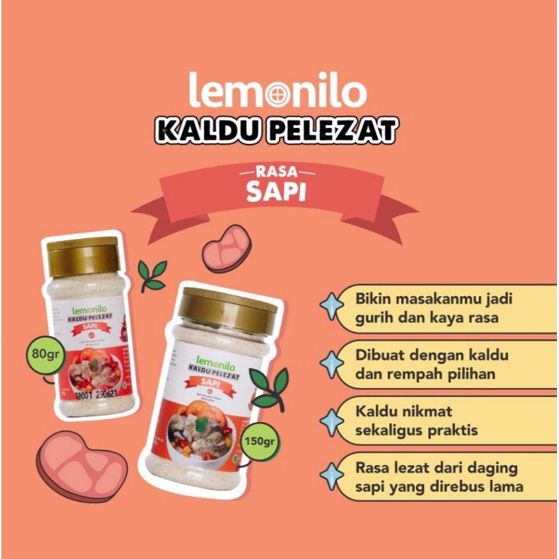 Pernah merasa tidak enak badan ketika mengonsumsi makanan bercita rasa gurih? Bisa jadi itu adalah efek dari MSG yang dijual di pasaran. Lemonilo menginovasi bumbu penyedap sehingga terciptalah Lemonilo Kaldu Pelezat Alami Sapi yang dibuat dari bahan alami untuk menciptakan sensasi sehat dan nikmat dalam satu sajian. Kaldu sapi ini dibuat dari bahan alami segar yang memastikan rasa alami dan sehat serta bebas dari bahan pengawet, perasa, dan pewarna buatan. Kaldu sapi ini cocok untuk digunakan pada sup, gulai, bakso, ataupun aneka sajian Indonesia lainnya. Sajikan kelezatan alami yang sesungguhnya untuk seluruh anggota keluarga Anda dengan tambahan kaldu sapi alami Lemonilo Kaldu Pelezat Alami Sapi!