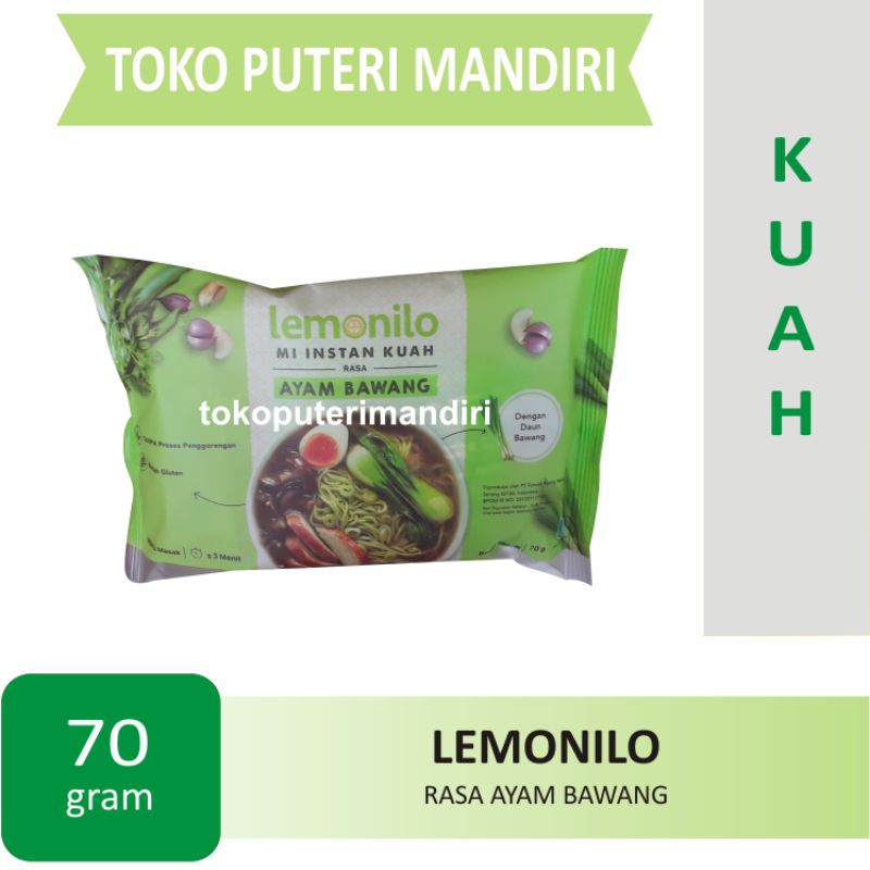 Lemonilo Mie Instan Alami yang hadir dengan rasa mie ayam bawang yang aman dikonsumsi semua kalangan karena terbuat dari Bahan dan nutrisi alami, tanpa proses penggorengan, tanpa pewarna, tanpa pengawet, tanpa msg tambahan, rendah glutin dan 0% trans fat. Mie ini hadir dengan warna hijau yang menjadikan mie ini semakin terlihat lezat, warna hijau yang dihasilkan dari Bayam karena terbuat dari bahan yang alami. Hadir dalam kemasan 70g, mudah dan praktis untuk dibuat.