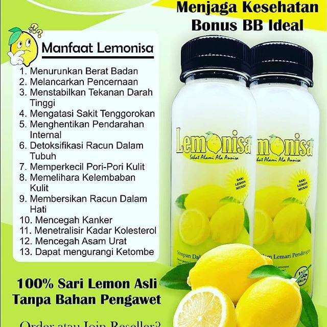 Lemonisa buat diet atau untuk mengobati berbagai macam penyakit juga bisa insha Allah manfaatnya nyata soalnya dari perasan sari lemon asli dan tanpa pengawet. Buat yang minat bisa dm atau hubungi nomor yang tersedia di feed ya #infotegal #exploretegal #jualbelitegal #radartegal #tegalsehat