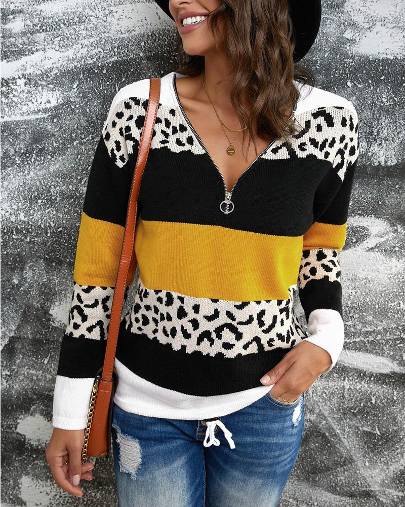 Leopard Print Colorblock Zip Front Drawstring Sweater, Yellow
