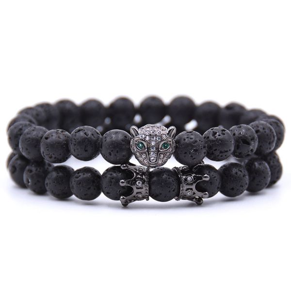 Leopard head punk yoga Bracelet Pave CZ Crown ball Black lava Stone Bead Bracelet for Men Women Jewelry gift dropshipping