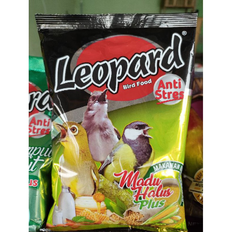 Leopard madu halus plus anti stres, Meningkatkan kekebalan tubuh dan keseimbangan gizi yang terjamin, meningkatkan kualitas suara dan keindahan bulu, membuat burung rajin berkicau dan tahan terhadap penyakit, melancarkan pencernaan dan pertumbuhan otot. Berat 250 gr.