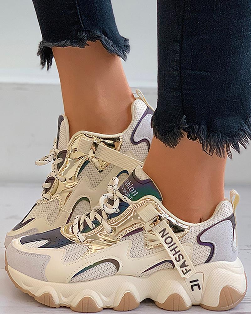 Letter Pattern Colorblock Lace-up Sneaker, Beige