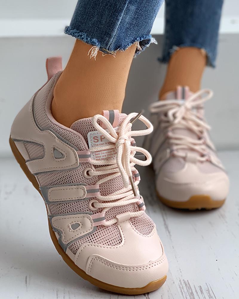 Letter Pattern Colorblok Lace-Up Sneakers, Pink