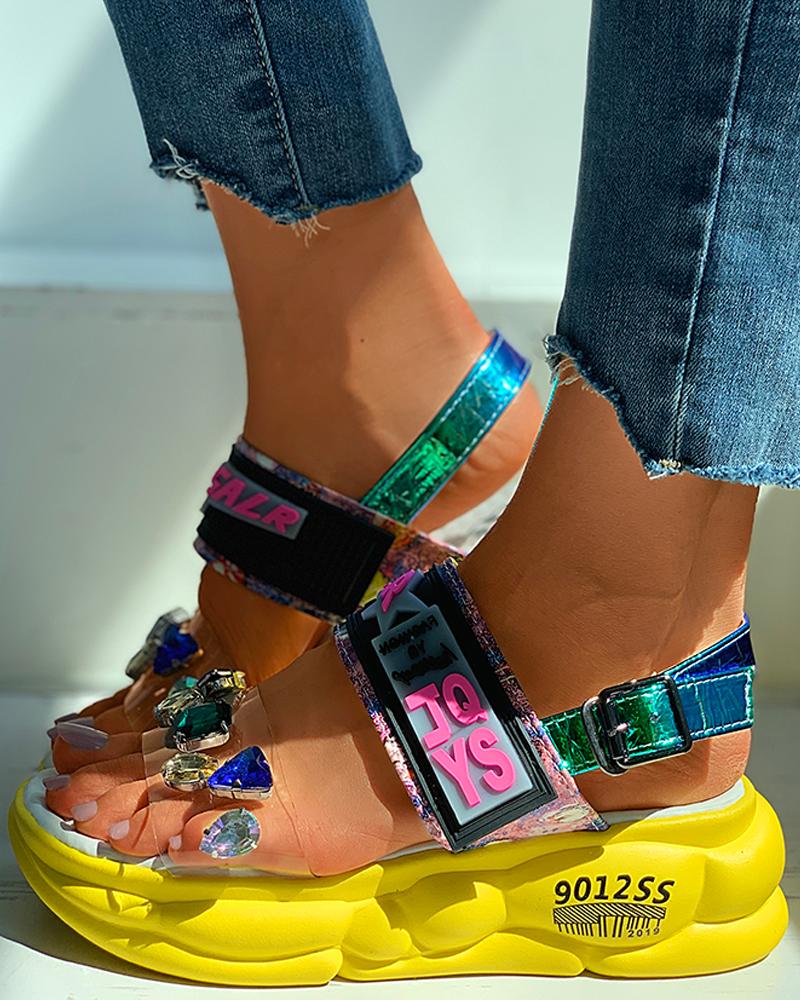 Letter Pattern Rhinestone Muffin Sandals, Yellow