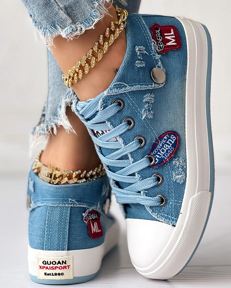 Letter Pattern Ripped Lace-up Sneakers, Lighted blue