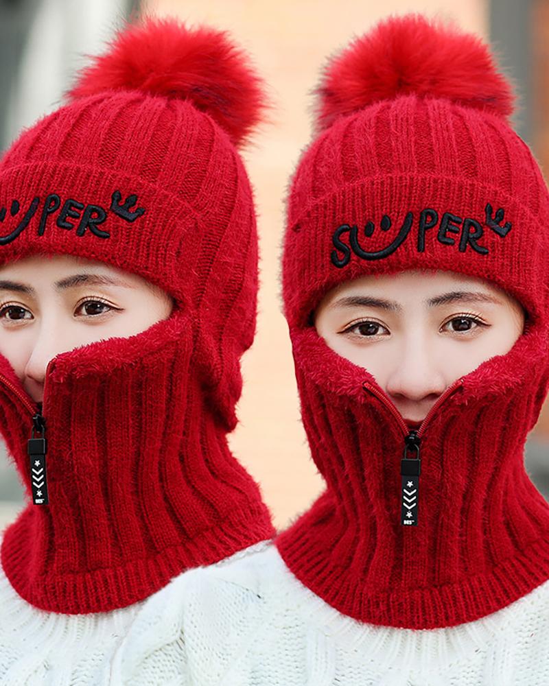 Letter Pattern Zip Cutout Pom Pom Cuffed Beanie, Red