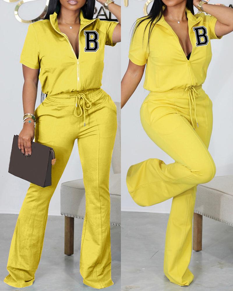 Letter Pattern Zipper Design Coat & Drawstring Pants Set, Yellow