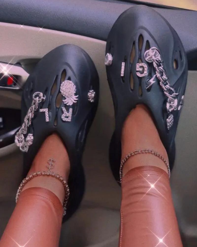 Letter Pineapple Pattern Rhinestone Chain Decor Clogs, Black