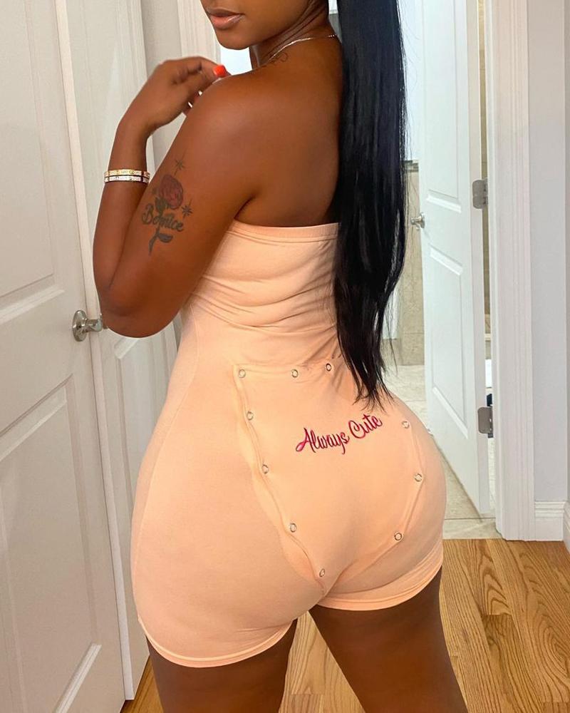 Letter Print Off Shoulder Functional Buttoned Design Romper, Apricot