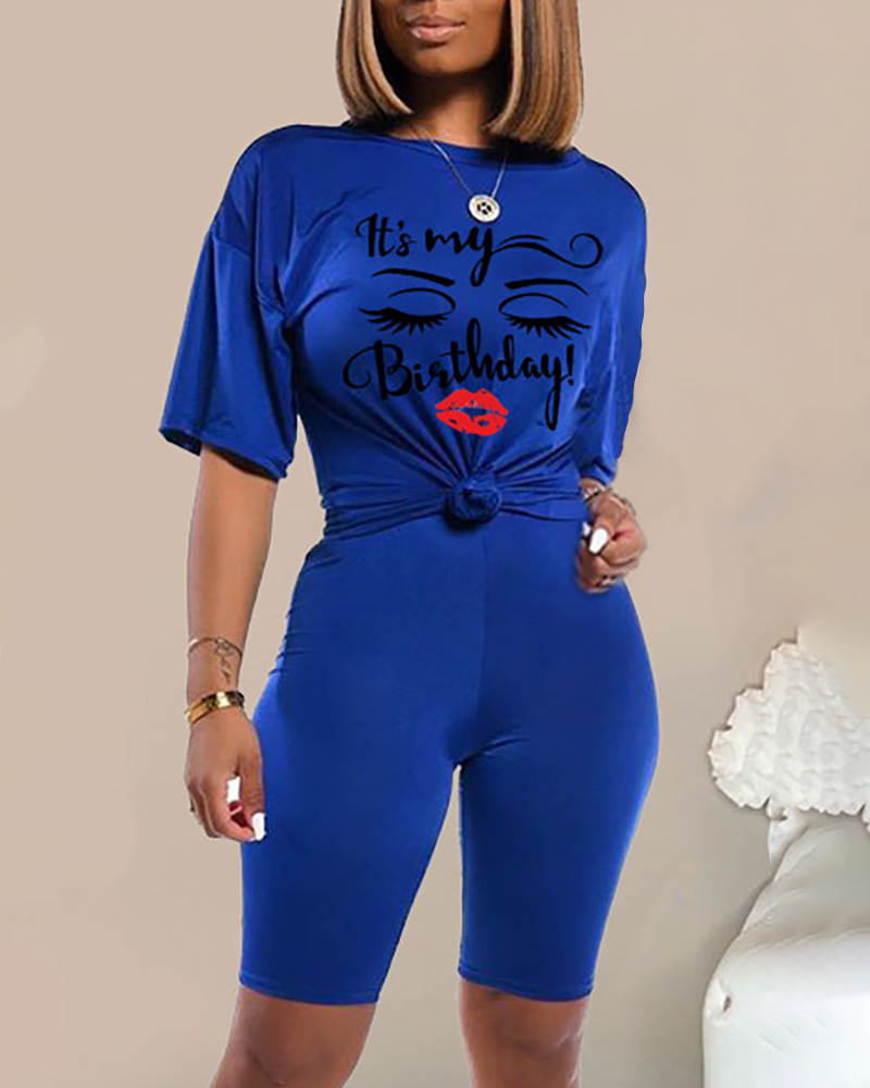Letter Print Round Neck Top & Shorts Set, Dark blue