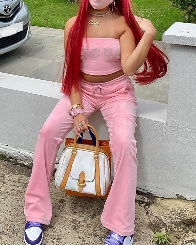 Letter Rhinestone Top & Eyelet Drawstring Pants Set, Pink