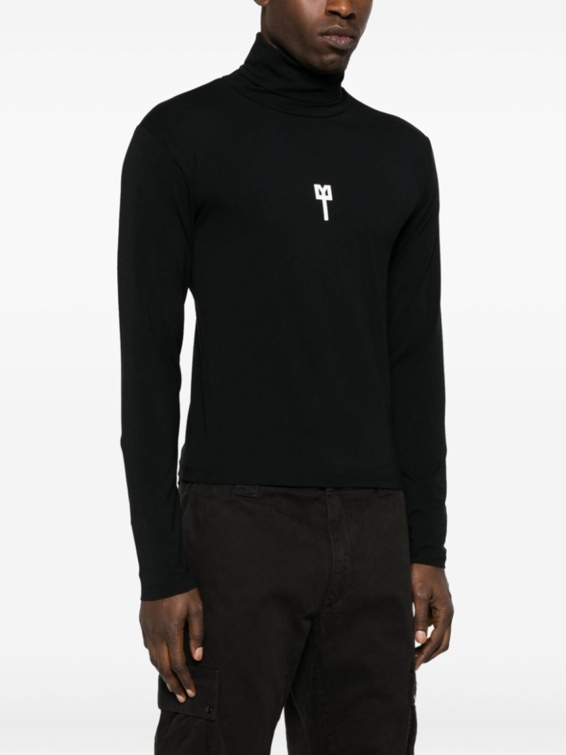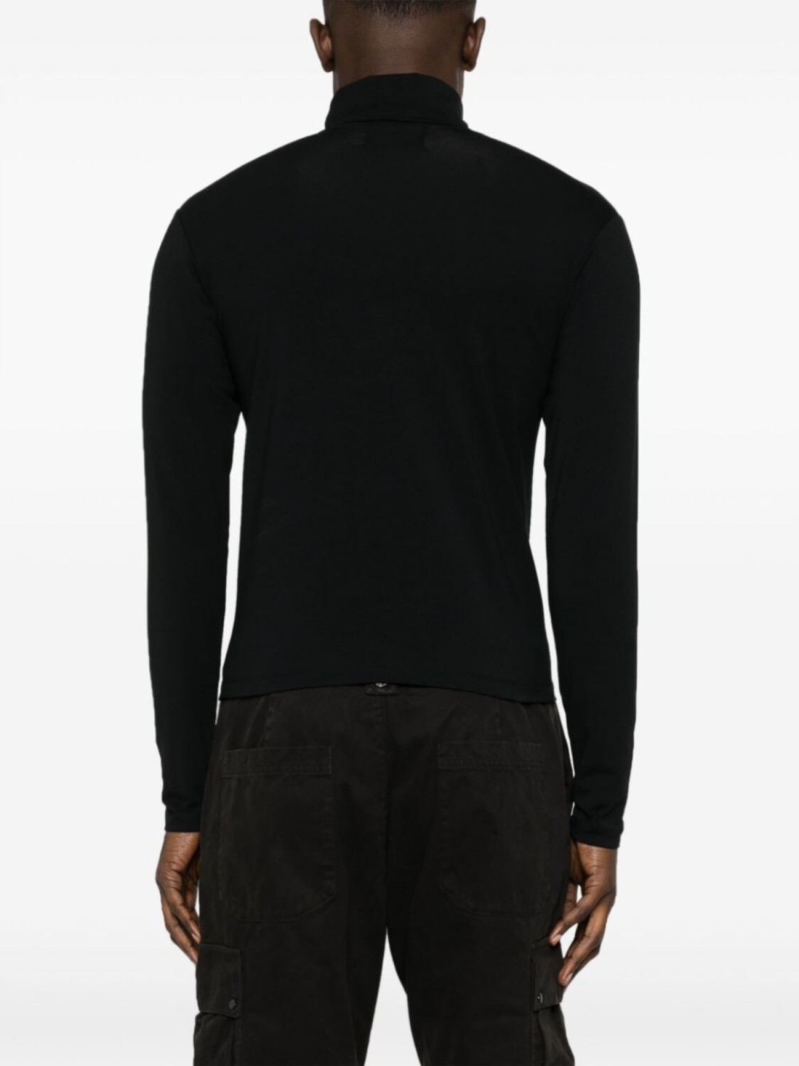Черный, эластичный хлопок, логотип спереди, высокий воротник, длинные рукава и прямой подол.