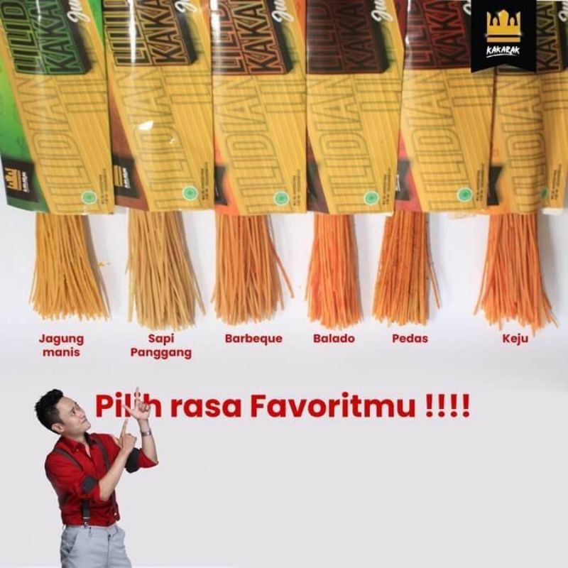 yups lilidian kakarak, terbuat dari mie lidi pilihan dengan rasa yang khas dan bumbu rempah rahasia yang membuatsensasi rasa mie lidi nya semakin khas, lidinya sepanjanng 30 cm , empuk, renyah